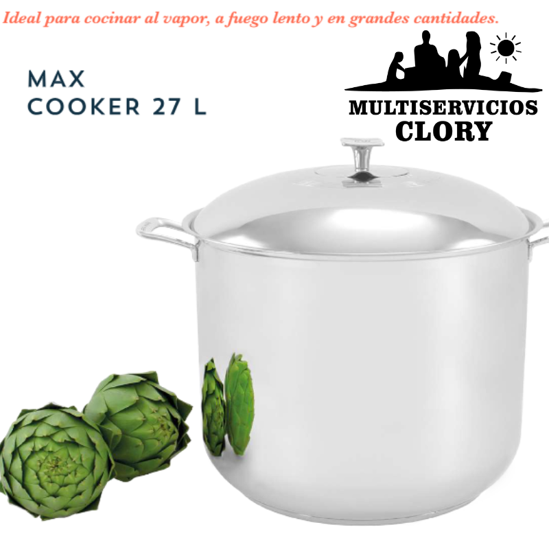 Olla Max Cooker de 27 litros, perteneciente a la línea Piezas Jumbo. La imagen muestra una olla grande de acero inoxidable con tapa y asas laterales, diseñada para cocinar al vapor, a fuego lento y en grandes cantidades. Tiene una  garantía vitalicia así como su compatibilidad con cocinas de inducción.